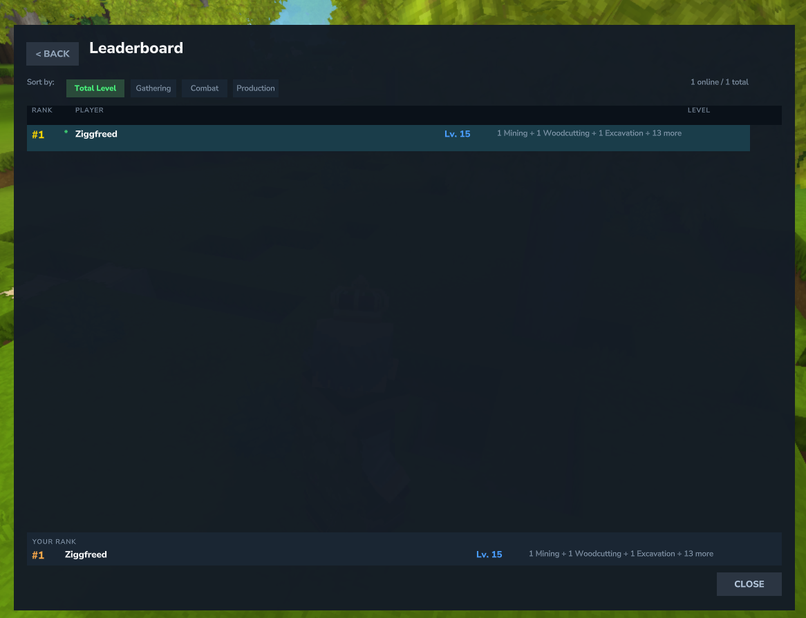 - Category Filters - Sort by Total Level, Gathering, Combat, or Production