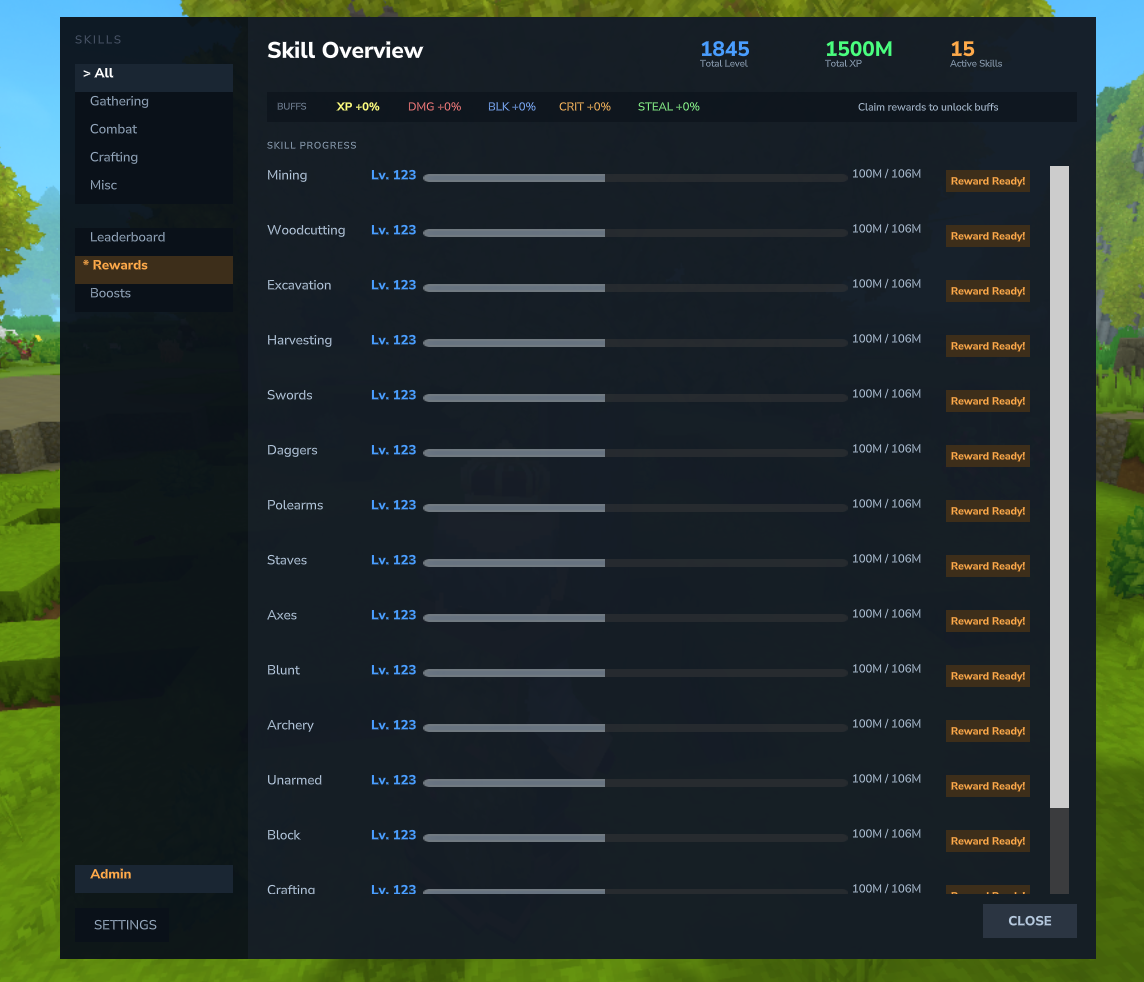 - Combat (11) - Swords, Daggers, Polearms, Staves, Axes, Blunt, Archery, Unarmed, Block, Taming, Acrobatics